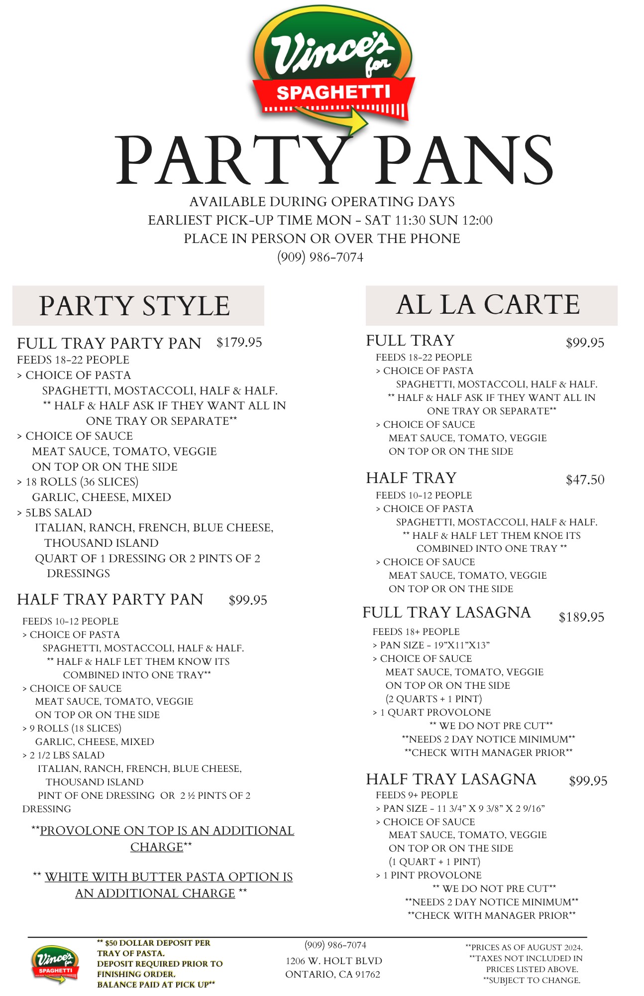 Located in Ontario, CA. Vince's Spaghetti Ontario specializes in dine-in and catering and family-sized Italian dishes. Everything made fresh in-house. 10% off for police and firefighters in uniform. Call or visit today.